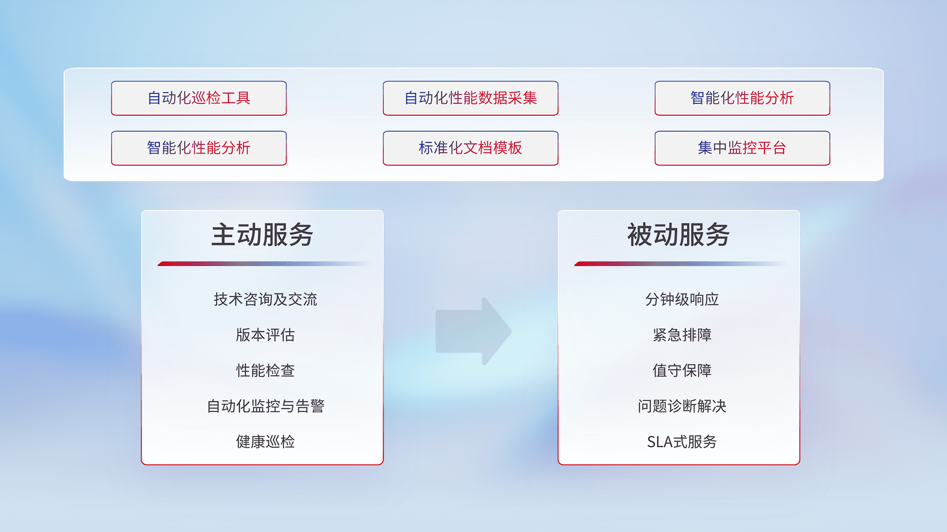 智能化工具和标准化文档,,,保障服务质量,,,,提供主动服务(包含技术咨询、、版本评估、、性能检查、、、自动化监控与告警、、、、健康巡检)和被动服务包含(分钟级响应、、紧急排障、、值守保障、、、、问题诊断解决、、、、SLA服务)。。。